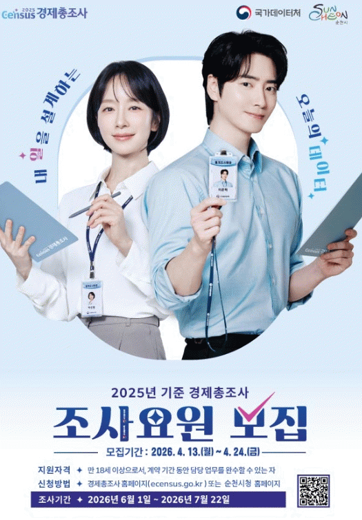 [¹Ìµð¾îÀü³² ÀÓ¼º¿Ï ±âÀÚ] ¼øÃµ½Ã´Â ¿À´Â 6¿ùºÎÅÍ ½Ç½ÃµÇ´Â 2025³â ±âÁØ °æÁ¦ÃÑÁ¶»ç ¾÷¹«¸¦ ¼öÇàÇÒ Á¶»ç¿ä¿øÀ» ¿À´Â 13ÀϺÎÅÍ ¸ðÁýÇÑ´Ù°í ¹àÇû´Ù. ¸ðÁý ±Ô¸ð´Â ÃÑ 71¸íÀ¸·Î Á¶»ç¾÷¹«¸¦ ÃѰýÇÏ´Â ÃѰü¸®ÀÚ 1¸í, Á¶»çÁö¿ø ¹× Á¶»ç¿ø °ü¸®¸¦¡¦