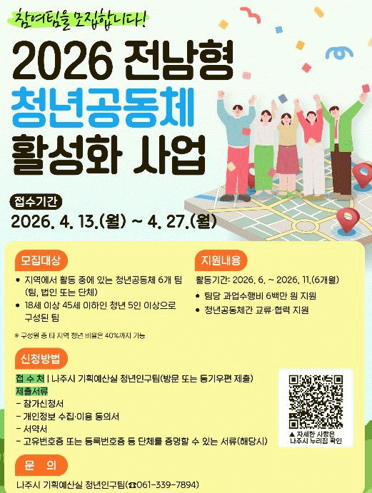[¹Ìµð¾îÀü³² Á¦°¥´ëÁ¾ ±âÀÚ]Àü³² ³ªÁֽô 10ÀÏ Ã»³âµéÀÇ Áö¿ª Ȱµ¿ ±â¹Ý ¸¶·Ã ¹× Áö¿ª Ȱ¼ºÈ¸¦ µµ¸ðÇϱâ À§ÇØ ¡®2026³â û³â°øµ¿Ã¼ Ȱ¼ºÈ »ç¾÷¡¯¿¡ Âü¿©ÇÒ ÆÀÀ» ¸ðÁýÇÑ´Ù°í ¹àÇû´Ù. û³â°øµ¿Ã¼ Ȱ¼ºÈ »ç¾÷Àº û³âµéÀÌ Áö¿ª»çȸ ±¸¼º¡¦