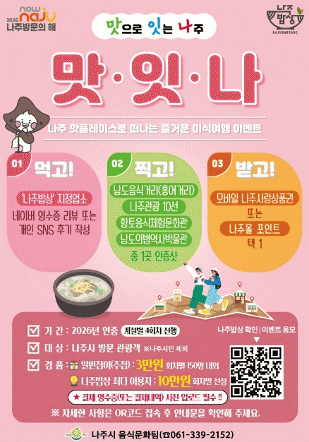 [¹Ìµð¾îÀü³² Á¦°¥´ëÁ¾ ±âÀÚ]Àü³² ³ªÁֽð¡ ¡®2026 ³ªÁֹ湮ÀÇ ÇØ¡¯¸¦ ¸Â¾Æ ½Ã ´ëÇ¥ À½½Ä ºê·£µåÀÎ ¡®³ªÁÖ¹ä»ó¡¯À» ¾Õ¼¼¿î »ç°èÀý ¹Ì½Ä À̺¥Æ® ¡®¸ÀÀ¸·Î ÀÕ´Â ³ªÁÖ, ¡®¸ÀÀÕ³ª¡¯ÀÇ 2ȸÂ÷(º½) ¿î¿µÀ» º»°ÝÀûÀ¸·Î ½ÃÀÛÇÑ´Ù. À̹ø À̺¥Æ®´Â ³ª¡¦