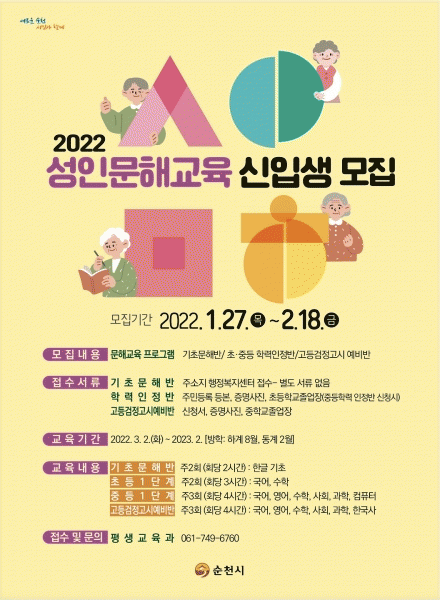 [¹Ìµð¾îÀü³² ÀÓ¼º¿Ï ±âÀÚ] ¼øÃµ½Ã´Â ¿À´Â 18ÀϱîÁö 2022³â ¼ºÀÎ ¹®Çر³À° ½ÅÀÔ»ýÀ» ¸ðÁýÇÑ´Ù. ¸ðÁý°úÁ¤Àº Ãʵî1´Ü°è¡¤Áßµî1´Ü°è ÇзÂÀÎÁ¤¹Ý, °íµî °ËÁ¤°í½Ã ¿¹ºñ¹Ý°ú ±âÃÊÇѱ۱³½ÇÀÎ ¡®±Û»ù±³½Ç¡¯ ÃÑ 4°¡Áö °úÁ¤À¸·Î ¸ðµÎ ¸¸ 18¼¼ ÀÌ»ó ¡¦