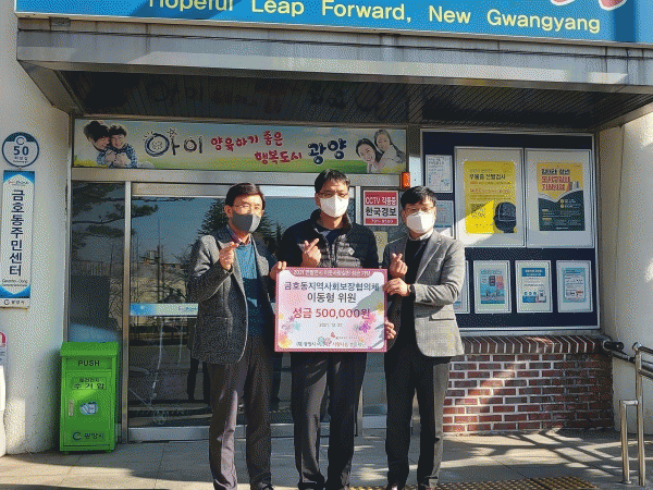 [¹Ìµð¾îÀü³² ÀÓ¼º¿Ï ±âÀÚ] ±¤¾ç½Ã ±ÝÈ£µ¿ Áö¿ª»çȸº¸ÀåÇùÀÇü À̵¿Çü À§¿øÀÌ 12¿ù 22ÀÏ ±ÝÈ£µ¿»ç¹«¼Ò¿¡¼ ±¤¾çÁ¦Ã¶¼Ò ¡®ÀÌ´ÞÀÇ ºÀ»ç¿Õ¡¯À¸·Î ¼±Á¤µÅ ¹ÞÀº ½Ã»ó±Ý 50¸¸¿ø Àü¾×À» ±¤¾ç½Ã»ç¶û³ª´®º¹ÁöÀç´Ü¿¡ ±âŹÇß´Ù. À̵¿Çü À§¿øÀº Æò¼Ò ¡¦