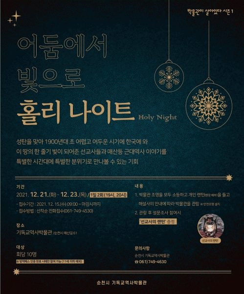 [¹Ìµð¾îÀü³² ÀÓ¼º¿Ï ±âÀÚ] ¼øÃµ½Ã´Â ¿À´Â 21ÀϺÎÅÍ 23ÀϱîÁö 3Àϰ£ ±âµ¶±³¿ª»ç¹Ú¹°°ü¿¡¼ ¼ºÅº¸ÂÀÌ Æ¯º° ÇØ¼³ ÇÁ·Î±×·¥À» ¿î¿µÇÑ´Ù. À̹ø ÇÁ·Î±×·¥Àº ¡®¹Ú¹°°üÀÌ »ì¾ÆÀÖ´Ù ½ÃÁð1 ¡®¾îµÒ¿¡¼ ºûÀ¸·Î: Ȧ¸®³ªÀÌÆ®¡¯¡¯¸¦ ÁÖÁ¦·Î ¹Ú¹°°ü Á¶¸í¡¦
