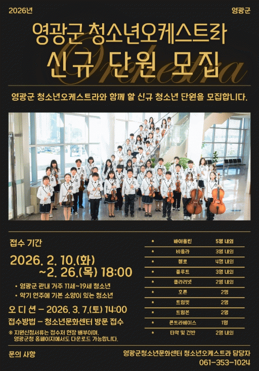 [¹Ìµð¾îÀü³² Á¦°¥´ëÁ¾ ±âÀÚ]¿µ±¤±ºÀº Áö¿ª û¼Ò³âµéÀÇ ¹®È¿¹¼ú ¿ª·® °È¿Í °ÇÀüÇÑ ¼ºÀåÀ» Áö¿øÇϱâ À§ÇØ ¡®2026³â ¿µ±¤±º û¼Ò³â¿ÀÄɽºÆ®¶ó ½Å±Ô ´Ü¿ø¡¯À» ¸ðÁýÇÑ´Ù°í ¹àÇû´Ù. ¿µ±¤±º û¼Ò³â¿ÀÄɽºÆ®¶ó´Â °ü³» û¼Ò³âÀ» ´ë»óÀ¸·Î ü°è¡¦