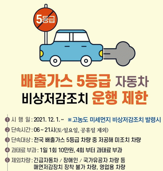 [¹Ìµð¾îÀü³² ÀÓ¼º¿Ï ±âÀÚ] ±¤¾ç½Ã´Â ¿À´Â 12¿ù 1ÀϺÎÅÍ ´ë±âÁú °³¼±°ú ¹Ì¼¼¸ÕÁö Àú°¨À» À§ÇØ ¡®°í³óµµ ¹Ì¼¼¸ÕÁö ºñ»óÀú°¨Á¶Ä¡¡¯ ¹ß·É ½Ã ¹èÃâ°¡½º 5µî±Þ Â÷·®ÀÇ ¿îÇàÀ» Á¦ÇÑÇÑ´Ù. ¹èÃâ°¡½º 5µî±Þ Â÷·® ¿îÇà Á¦ÇÑÀº ¡®¹Ì¼¼¸ÕÁö Àú°¨ ¹× °ü¡¦