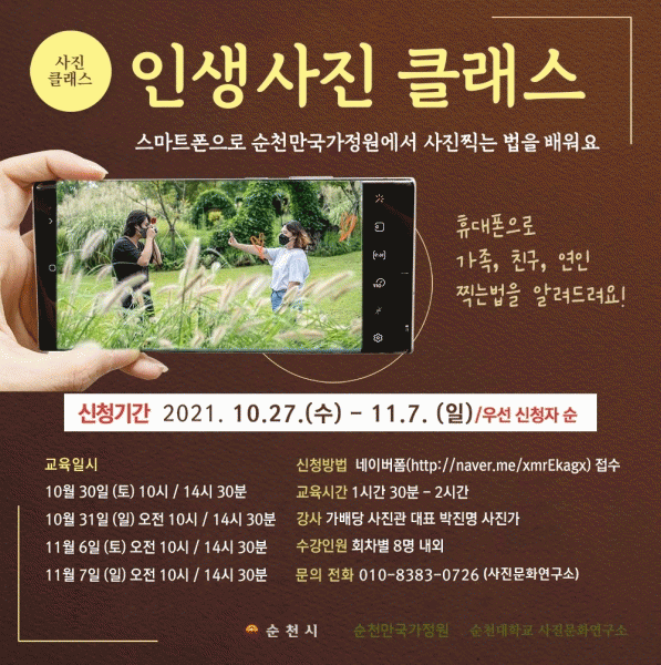 [¹Ìµð¾îÀü³² ÀÓ¼º¿Ï ±âÀÚ] ¼øÃµ½Ã´Â ¿À´Â 10¿ù 30ÀϺÎÅÍ 11¿ù 7ÀϱîÁö 2ÁÖ°£ ¸ÅÁÖ Å䡤ÀÏ¿äÀÏ¿¡ ¡®¼øÃµ¸¸±¹°¡Á¤¿ø Àλý»çÁøÅ¬·¡½º¡¯¸¦ ¿î¿µÇÑ´Ù. Àλý»çÁøÅ¬·¡½º´Â »çÁø Àü¹®°¡°¡ ¼øÃµ¸¸±¹°¡Á¤¿ø¿¡¼ ¿Ã°¡À» ÃÖ°íÀÇ Àλý»çÁø Âï´Â ±â¼úÀ»¡¦