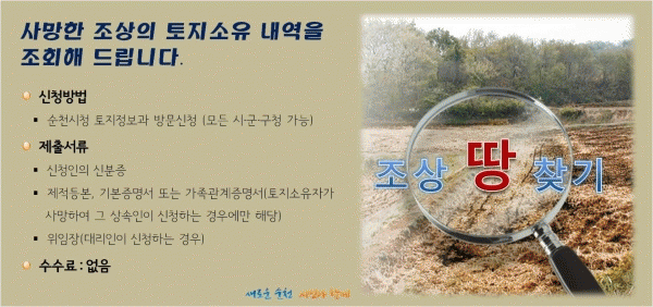 [¹Ìµð¾îÀü³² ÀÓ¼º¿Ï ±âÀÚ] ¼øÃµ½Ã´Â »ç¸ÁÇÑ Á¶»ó ¸íÀÇÀÇ ÅäÁö ÇöȲÀ» ã¾ÆÁÖ´Â ¡®Á¶»ó ¶¥ ã±â¡¯¼ºñ½º¸¦ ½ÃÇàÇϰí ÀÖ´Ù. ÀÌ ¼ºñ½º´Â Á¶»óÀÇ ÅäÁö ¼ÒÀ¯ÇöȲÀ» ¾ËÁö ¸øÇÏ´Â »ó¼ÓÀο¡°Ô ÅäÁö ¼ÒÀç Á¤º¸¸¦ Á¦°øÇÔÀ¸·Î½á Àç»ê±Ç Çà»ç¿¡ µµ¿ò¡¦