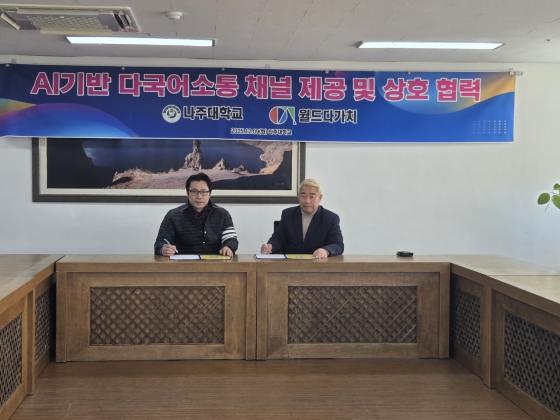 [¹Ìµð¾îÀü³² Á¦°¥´ëÁ¾ ±âÀÚ] ³ªÁÖ´ëÇб³(ÃÑÀå ±è¼ö¿¬)´Â 8ÀÏ ±³³» ±¹Á¦Çù·Âó ȸÀǽǿ¡¼ AI ±â¹Ý ´Ù±¹¾î ¼ÒÅë Ç÷§Æû ±â¾÷ ¢ß¿ùµå´Ù°¡Ä¡(´ëÇ¥ ±ÇÇØ¼®)¿Í ¿Ü±¹ÀÎ À¯ÇлýÀÇ ¼ÒÅë ¹× »ýȰ Á¤Âø Áö¿ø °È¸¦ À§ÇÑ ¾÷¹«Çù¾àÀ» ü°áÇß´Ù. ÀÌ¡¦