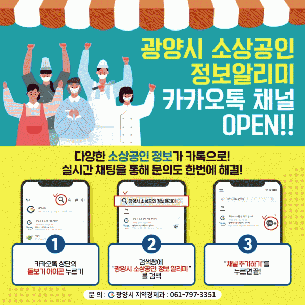 [¹Ìµð¾îÀü³² ÀÓ¼º¿Ï ±âÀÚ] ±¤¾ç½Ã´Â ´Ù¾çÇÑ ¼Ò»ó°øÀÎ Áö¿øÁ¤º¸¸¦ ºü¸£°í Æí¸®ÇÏ°Ô ¹Þ¾Æº¼ ¼ö ÀÖ´Â ¡®±¤¾ç½Ã ¼Ò»ó°øÀÎ Á¤º¸¾Ë¸®¹Ì¡¯ īī¿ÀÅå ä³ÎÀ» °³¼³ÇÑ´Ù. ¡®±¤¾ç½Ã ¼Ò»ó°øÀÎ Á¤º¸¾Ë¸®¹Ì¡¯ īī¿ÀÅå ä³ÎÀº ±âÁ¸ °ø¹® ¹ß¼Û, ȨÆäÀÌÁö¡¦