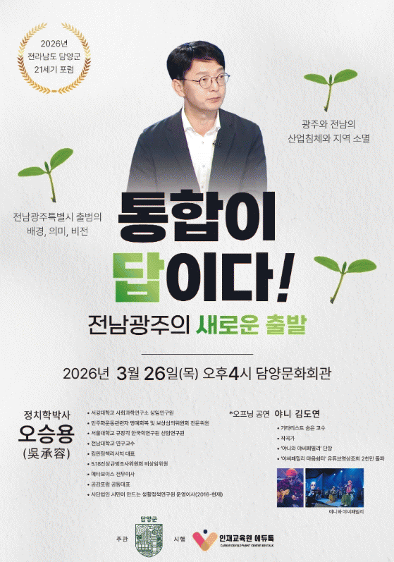 [¹Ìµð¾îÀü³² Á¦°¥´ëÁ¾ ±âÀÚ]´ã¾ç±ºÀÌ ¿À´Â 26ÀÏ ´ã¾ç¹®Èȸ°ü¿¡¼ ¡®Á¦192ȸ 21¼¼±â ´ã¾çÆ÷·³¡¯À» °³ÃÖÇÑ´Ù. À̹ø Æ÷·³Àº Àü³²¡¤±¤ÁÖ ÅëÇÕÀÇ Çʿ伺°ú ¹Ì·¡ ºñÀüÀ» ¸ð»öÇϱâ À§ÇØ Á¤Ä¡ÇÐ ¹Ú»ç ¿À½Â¿ë °»ç¸¦ ÃÊû, ¡®ÅëÇÕÀÌ ´äÀÌ´Ù. ¡¦