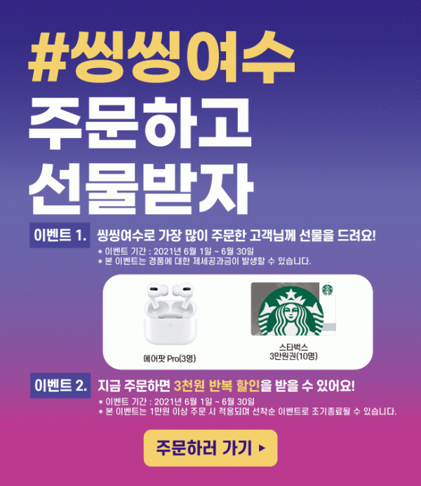 [¹Ìµð¾îÀü³² ÀüÇü¼º ±âÀÚ] ¿©¼ö½Ã°¡ Áö¿ª ¼Ò»ó°øÀÎÀ» µ½±â À§ÇÑ °ø°ø¹è´Þ¾Û ¡®¾Å¾Å¿©¼ö¡¯·Î ÁÖ¹®ÇÑ ¿©¼ö½Ã¹ÎÀ» ´ë»óÀ¸·Î 6¿ù 1ÀϺÎÅÍ ÇÑ ´Þ°£ 3õ¿ø ÁÖ¹® ÇÒÀÎ À̺¥Æ®¸¦ ½Ç½ÃÇÑ´Ù. ¾Û¿¡¼ ¼±°áÁ¦·Î 1¸¸¿ø ÀÌ»ó ÁÖ¹® ½Ã ¼±Âø¼ø 3,000¸í¿¡¡¦