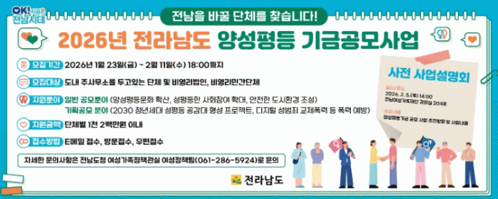 [¹Ìµð¾îÀü³² Á¦°¥´ëÁ¾ ±âÀÚ]Àü¶ó³²µµ°¡ ¾ç¼ºÆòµî ¹®È È®»ê°ú ¿©¼ºÀÇ »çȸÂü¿©¡¤±ÇÀÍ È®´ë¸¦ À§ÇØ ¿À´Â 11ÀϱîÁö ¡®2026 ¾ç¼ºÆòµî±â±Ý °ø¸ð»ç¾÷¡¯À» Á¢¼öÇÑ´Ù. ¿ÃÇØ´Â ¿¹»êÀ» Áõ¾×ÇÏ°í ±âȹ°ø¸ð ºÐ¾ß¸¦ ½Å¼³ÇØ Á¤Ã¥ ÇöÀå ´ëÀÀ·ÂÀ» °È¡¦