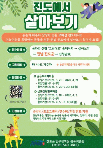 [¹Ìµð¾îÀü³² Á¦°¥´ëÁ¾ ±âÀÚ]Áøµµ±ºÀÌ Áøµµ¿¡¼ÀÇ »îÀ» 2~3°³¿ù µ¿¾È üÇèÇÒ ¼ö ÀÖ´Â ¡®Áøµµ¿¡¼ »ì¾Æº¸±â¡¯ Âü¿©ÀÚ¸¦ ¸ðÁýÇÑ´Ù. ¡®Áøµµ¿¡¼ »ì¾Æº¸±â¡¯´Â ±Í³ó, ±ÍÃÌÀ» Èñ¸ÁÇÏ´Â µµ½Ã¹ÎÀÌ ÀÏÁ¤ ±â°£ ³óÃÌ¿¡ °ÅÁÖÇÏ¸é¼ ³óÃÌ »ýȰÀ» ÀÌÇØ¡¦