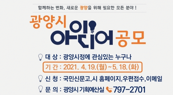 [¹Ìµð¾îÀü³² ÀüÇü¼º ±âÀÚ] ±¤¾ç½Ã´Â ½Ã¹ÎÀÌ °ø°¨ÇÏ´Â Âü½ÅÇÑ Á¤Ã¥ ¾ÆÀ̵ð¾î¸¦ ¹ß±¼Çϰí Áö¿ª ¿©°ÇÀ» ¹Ý¿µÇÑ ½ÇÇà·Â ³ôÀº ¾ÆÀ̵ð¾î¸¦ äÅÃÇϱâ À§ÇÑ ¡®½Ã¹Î ¾ÆÀ̵ð¾î °ø¸ðÀü¡¯À» °³ÃÖÇÑ´Ù. ¡®ÇÔ²²ÇÏ´Â º¯È, »õ·Î¿î ±¤¾ç¡¯À» ÁÖÁ¦·Î °æÁ¦¡¦