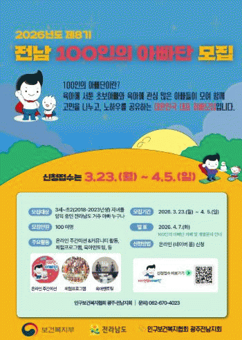 [¹Ìµð¾îÀü³² Á¦°¥´ëÁ¾ ±âÀÚ]Àü¶ó³²µµ´Â ¾ÆºüÀÇ À°¾Æ Âü¿©¸¦ È®´ëÇÏ°í °¡Á· Áß½ÉÀÇ °Ç°ÇÑ ¾çÀ°¹®È¸¦ È®»êÇϱâ À§ÇØ 2026³â Á¦8±â Àü³² 100ÀÎÀÇ ¾Æºü´Ü Âü¿©ÀÚ¸¦ ¸ðÁýÇÑ´Ù. ¸ðÁý ´ë»óÀº 3¼¼ºÎÅÍ ÃʵîÇб³ 2Çгâ(2018~2023³â»ý) Àڳฦ ¡¦