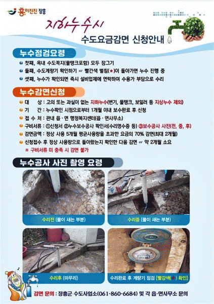[¹Ìµð¾îÀü³² Á¦°¥´ëÁ¾ ±âÀÚ] ÀåÈﱺÀº ÃÖ±Ù µ¿ÆÄ¿Í ÇØºù±â ±â¿Â º¯È µîÀ¸·Î ¼öµµ°üÀÌ ¾ó°í ³ì´Â Çö»óÀÌ ¹Ýº¹µÇ¾î ¼öµµ°ü ÆÄ¿ µî °¢Á¾ ´©¼ö»ç°í°¡ Áõ°¡ÇÔ¿¡ µû¶ó, ÁöÇÏ´©¼ö¿¡ µû¸¥ »ó¼öµµ ¿ä±Ý °¨¸é Á¤Ã¥¿¡ ´ëÇØ Àû±Ø È«º¸¿¡ ³ª¼¹´Ù. ÀÏ¡¦