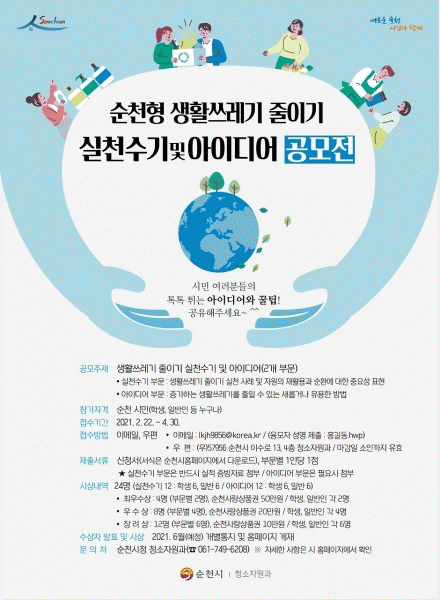 [¹Ìµð¾îÀü³² ÀüÇü¼º ±âÀÚ] ¼øÃµ½Ã´Â »ýȰ¾²·¹±â¡¤À½½Ä¹°¾²·¹±â µîÀ» ÁÙÀÏ ¼ö ÀÖ´Â ¹æ¾ÈÀ» °øÀ¯Çϱâ À§ÇØ ¿À´Â 4¿ù 30ÀϱîÁö »ýȰ¾²·¹±â ÁÙÀ̱⠽Çõ¼ö±â ¹× ¾ÆÀ̵ð¾î °ø¸ðÀüÀ» °³ÃÖÇÑ´Ù. À̹ø °ø¸ðÀüÀº ¼øÃµ½ÃÀÇ 2030³â±îÁö »ýȰ¾²·¹±â ¡¦