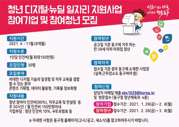 [¹Ìµð¾îÀü³² ±èÁ¤¿ì ±âÀÚ] ±¤ÁÖ µ¿±¸´Â µðÁöÅС¤´ºµô û³âÀÎÅÏÁö¿ø »ç¾÷À» º»°ÝÀûÀ¸·Î ÃßÁøÇϱâ À§ÇØ »ç¾÷¿¡ Âü¿©ÇÒ »ç¾÷ÀåÀ» ¿À´Â 2¿ù 4ÀϱîÁö ¸ðÁýÇÑ´Ù°í ¹àÇû´Ù. ¸ðÁý´ë»óÀº ÄÜÅÙÃ÷ ±âȹÇü ºòµ¥ÀÌÅÍ È°¿ëÇü ±â·Ï¹° Á¤º¸ÈÇü µîÀ¸·Î ¼¡¦