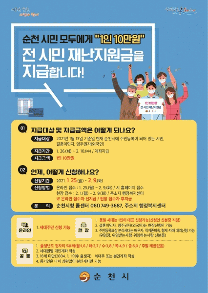 [¹Ìµð¾îÀü³² ÀüÇü¼º ±âÀÚ] ¼øÃµ½Ã´Â Àü ½Ã¹Î¿¡°Ô 1Àδç 10¸¸¿ø¾¿ Áö±ÞÇÏ´Â Àç³Áö¿ø±ÝÀ» Áö³ 1¿ù 25ÀϺÎÅÍ ¿Â¶óÀÎ ½ÅûÀ» ½ÃÀÛÇß°í ¿À´Â 2¿ù 1ÀϺÎÅÍ ÇöÀåÁ¢¼ö¸¦ °³½ÃÇÑ´Ù. ½Ã´Â Áö³ 1¿ù 28ÀϱîÁö ¼øÃµ½Ã¹ÎÀÇ 51% ½ÅûÁ¢¼ö¸¦ ¿Ï·áÇßÀ¸¡¦