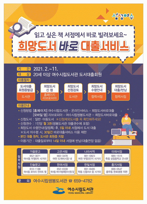 [¹Ìµð¾îÀü³² ÀüÇü¼º ±âÀÚ] ¿©¼ö½Ã´Â ÀÐ°í ½ÍÀº Ã¥À» Áö¿ª¼Á¡¿¡¼ ¹Ù·Î ºô·Áº¸´Â ¡®Èñ¸Áµµ¼¹Ù·Î´ëÃ⼺ñ½º¡¯¸¦ ½ÃÇàÇÑ´Ù°í ¹àÇû´Ù. ½Åû ±â°£Àº ¿ÃÇØ 2¿ùºÎÅÍ 11¿ù±îÁöÀ̸ç 20¼¼ ÀÌ»ó ¿©¼ö½Ã¸³µµ¼°ü µµ¼´ëÃâȸ¿øÀÌ¸é ´©±¸³ª ¿ù 3±Ç¾¿¡¦