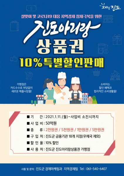 [¹Ìµð¾îÀü³² Á¦°¥´ëÁ¾ ±âÀÚ] Áøµµ±ºÀÌ Áøµµ¾Æ¸®¶û»óǰ±ÇÀ» 10% Ưº° ÇÒÀΡ¤ÆÇ¸ÅÇÑ´Ù. 25ÀÏ Áøµµ±º¿¡ µû¸£¸é Äڷγª19 Àå±âÈ·Î ÀÎÇØ À§ÃàµÈ Áö¿ª°æÁ¦ Ȱ¼ºÈ¸¦ À§ÇØ ¼³ ¸íÀýÀ» ¾ÕµÎ°í 50¾ï¿ø ¼ÒÁø½Ã ±îÁö 10% Ưº° ÇÒÀÎÇØ ÆÇ¸ÅÇÑ´Ù. »ó¡¦