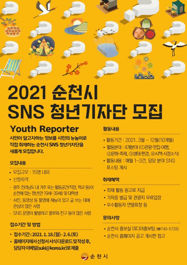 [¹Ìµð¾îÀü³² ÀüÇü¼º ±âÀÚ] ¼øÃµ½Ã´Â ½ÃÀÇ ´Ù¾çÇÏ°í »ý»ýÇÑ ¼Ò½ÄÀ» ½Ã¹ÎÀÇ ´«³ôÀÌ·Î Á÷Á¢ ÃëÀçÇÏ´Â SNS û³â±âÀÚ´ÜÀ» ¿À´Â 18ÀϺÎÅÍ 2¿ù 6ÀϱîÁö 20Àϰ£ ¸ðÁýÇÑ´Ù. ¼øÃµ½Ã SNS û³â±âÀÚ´ÜÀº ½Å¼ÓÇÑ ½ÃÃ¥ È«º¸ ¹× ½Ã¹Î°ø°¨Çü ÄÜÅÙÃ÷ ¹ß±¼À»¡¦