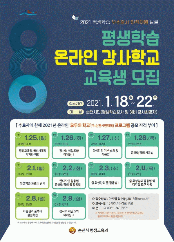 [¹Ìµð¾îÀü³² ÀüÇü¼º ±âÀÚ] ¼øÃµ½Ã´Â 2021³â À§µå Äڷγª ½Ã´ë ´Þ¶óÁø Æò»ý±³À° ÇöÀåȯ°æ¿¡ ¸Â´Â ¿ì¼öÇÑ Æò»ýÇнÀ °»ç¸¦ ¹ß±¼Çϰí À¯ÀÍÇÑ ±³À°ÇÁ·Î±×·¥ Á¦°øÀ» À§ÇØ °ÀǽýºÅÛÀ» °³¼±ÇØ ¿î¿µÇÑ´Ù. ±âÁ¸ ¡®¼øÃµ½Ã¹Î´ëÇС¯À̶ó´Â ¸íεµ ¡¦
