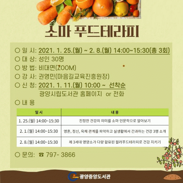 [¹Ìµð¾îÀü³² ÀüÇü¼º ±âÀÚ] ±¤¾çÁß¾Óµµ¼°üÀÌ »õÇØ ù ÇÁ·Î±×·¥À¸·Î °ü³» û¼Ò³â°ú ÀÏ¹Ý ½Ã¹ÎÀ» ´ë»óÀ¸·Î ÇÑ Å¸·Î½É¸®¿Í ¼Ò¸¶ ǪµåÅ×¶óÇÇ °úÁ¤ ÇÁ·Î±×·¥À» ¿î¿µÇÑ´Ù°í 6ÀÏ ¹àÇû´Ù. û¼Ò³âÀÌ Âü¿©Çϴ Ÿ·Î ½É¸® °úÁ¤Àº ¿À´Â 1¿ù 26Àϰú 2¡¦