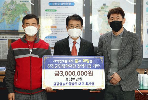 [¹Ìµð¾îÀü³² Á¦°¥´ëÁ¾ ±âÀÚ] Áö³ 21ÀÏ ±Ý±¤¿µ³óÁ¶ÇÕ¹ýÀÎ ÃÖÁö¿µ ´ëÇ¥°¡ 300¸¸¿øÀ», °ÁøÁö¿ª ÀηÂÇùÀÇȸ ½ÅÇö¼ö ȸÀå, Çѱ¹¸ÀÀ½½Ä¿¬±¸¿ø À̼ºÈñ ¿øÀåÀÌ °¢ 100¸¸¿øÀÇ ÀåÇбÝÀ» °Áø±º¹ÎÀåÇÐÀç´Ü¿¡ ±âŹÇß´Ù. ±Ý±¤¿µ³óÁ¶ÇÕ¹ýÀÎÀº Ä¥·®¿¡¡¦