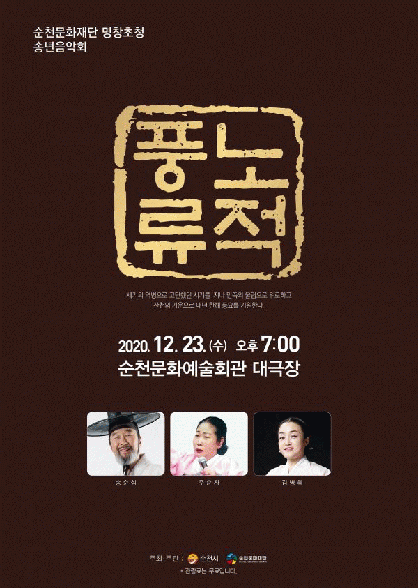 [¹Ìµð¾îÀü³² ÀüÇü¼º ±âÀÚ] ¼øÃµ¹®ÈÀç´ÜÀº Äڷγª19·Î ÁöÄ£ Áö¿ª¹ÎµéÀ» À§·ÎÇÏ´Â ¡®¼øÃµ¹®ÈÀç´Ü ¸íâÃÊû ¼Û³âÀ½¾Çȸ¡¯¸¦ ¿À´Â 23ÀÏ Àú³á 7½Ã ¼øÃµ¹®È¿¹¼úȸ°ü ´ë±ØÀå¿¡¼ °³ÃÖÇÑ´Ù. ¼øÃµ½Ã¿Í ¼øÃµ¹®ÈÀç´ÜÀÌ ÁÖÃÖ¡¤ÁÖ°üÇÏ´Â À̹ø °ø¿¬¡¦