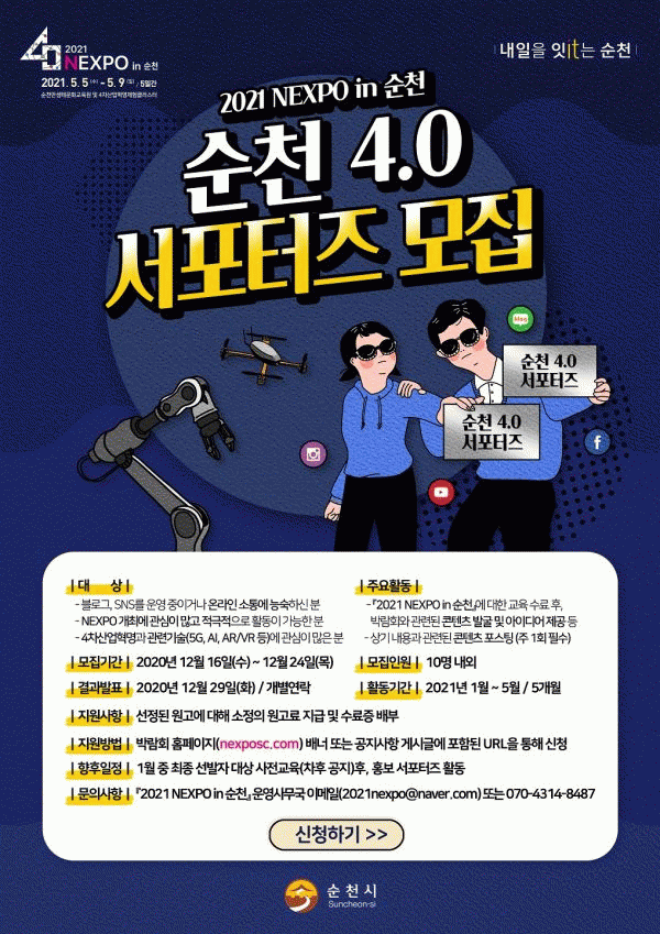 [¹Ìµð¾îÀü³² ÀüÇü¼º ±âÀÚ] ¼øÃµ½Ã°¡ 5G¡¤AI µî ÷´Ü±â¼ú Áß½ÉÀÇ ¹Ì·¡ »îÀ» ÇÑ¹ß ¾Õ¼ °æÇèÇÒ ¼ö ÀÖ´Â 4Â÷»ê¾÷¹Ú¶÷ȸ ¡®2021 NEXPO in ¼øÃµ¡¯ÀÇ ¼Æ÷ÅÍÁ ¸ðÁýÇÑ´Ù. ¼Æ÷ÅÍÁî´Â 2021³â 1¿ùºÎÅÍ 5¿ù±îÁö ¹Ú¶÷ȸ °ü·Ã ÄÜÅÙÃ÷¸¦ ¹ß±¼Çϰš¦
