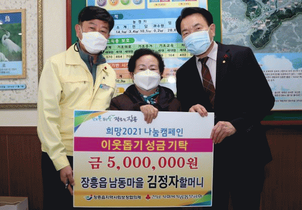 [¹Ìµð¾îÀü³² Á¦°¥´ëÁ¾ ±âÀÚ] ÀåÈïÀ¾Áö¿ª»çȸº¸ÀåÇùÀÇü´Â 11ÀÏ ÀåÈïÀ¾ ³²µ¿¸¶À»¿¡¼ °ÅÁÖÇÏ´Â ±èÁ¤ÀÚ ÇҸӴϰ¡ Àڽź¸´Ù ¾î·Á¿î ÀÌ¿ôÀ» À§ÇØ ½á´Þ¶ó¸ç ¼º±Ý 500¸¸¿øÀ» ±âŹÇß´Ù°í ¹àÇû´Ù. ±è ÇÒ¸Ó´Ï´Â ¡°5³²¸Å·Î ž ¾î¸±Àû ³Ê¹« Èûµé¡¦