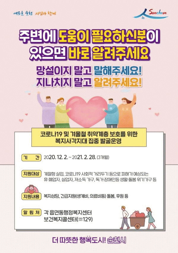 [¹Ìµð¾îÀü³² ÀüÇü¼º ±âÀÚ] ¼øÃµ½Ã´Â ÃÖ±Ù Äڷγª19ÀÇ ±Þ¼ÓÇÑ È®»ê°ú Àå±âÈ ¿ì·Á¿¡ µû¶ó 12¿ùºÎÅÍ ³»³â 2¿ù ¸»±îÁö µ¿Àý±â º¹ÁöÀ§±â°¡±¸ ÁýÁß ¹ß±¼¿¡ ³ª¼¹´Ù. ¹ß±¼´ë»óÀº °èÀýÇü ½Ç¾÷ÀÚ¿Í Äڷγª19·Î ÀÎÇØ ÇÇÇØ°¡ ¿¹»óµÇ´Â ÈÞ¡¤Æó¾÷ÀÚ, ¡¦