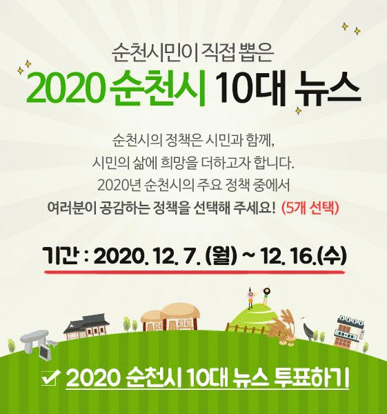 [¹Ìµð¾îÀü³² ÀüÇü¼º ±âÀÚ] ¼øÃµ½Ã´Â ¿À´Â 7ÀϺÎÅÍ 16ÀϱîÁö 10Àϰ£ ¡®2020³â ¼øÃµ½Ã 10´ë ´º½º¡¯¼±Á¤À» À§ÇÑ ¿Â¶óÀÎ ¼³¹®Á¶»ç¸¦ ÁøÇàÇÑ´Ù. ¼øÃµ½Ã 10´ë ´º½º´Â ¸Å³â ¿¬¸» ¼øÃµ½Ã°¡ ½ÃÇàÇÑ ÁÖ¿ä Á¤Ã¥µé¿¡ ´ëÇÑ ½Ã¹ÎÀÇ ¸ñ¼Ò¸®¸¦ µè°í ¼øÃµ¡¦