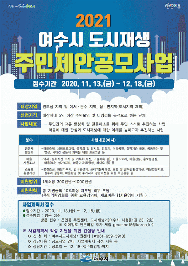 [¹Ìµð¾îÀü³² ÀüÇü¼º ±âÀÚ] ¿©¼ö½Ã°¡ Áö¿ªÆ¯»ö¿¡ ¸Â´Â µµ½ÃÀç»ý»ç¾÷ ÃßÁøÀ» À§ÇØ 2021³âµµ µµ½ÃÀç»ý ÁÖ¹ÎÁ¦¾È °ø¸ð»ç¾÷ Âü¿©ÆÀÀ» ¸ðÁýÇÑ´Ù°í 2ÀÏ ¹àÇû´Ù. ½Ã¿¡ µû¸£¸é ¿øµµ½É Ȱ¼ºÈ»ç¾÷ 5~7°ÇÀ» ¼±Á¤ÇØ 300¸¸¿ø¿¡¼ ÃÖ´ë 1000¸¸¿ø±îÁö ¡¦
