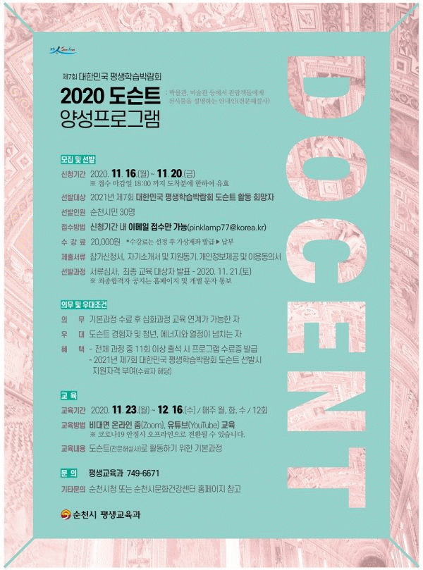 [¹Ìµð¾îÀü³² ÀüÇü¼º ±âÀÚ] ¼øÃµ½Ã´Â 2021³â Á¦7ȸ ´ëÇѹα¹ Æò»ýÇнÀ¹Ú¶÷ȸÀÇ ½Ã¹Î ÁÖµµÀÇ ³»½Ç ÀÖ´Â ÃßÁø ¹× ¹Ú¶÷ȸÀÇ ¼º°øÀû °³ÃÖ¿¡ ±â¿©ÇÒ Àü¹®Çؼ³»ç µµ½¼Æ® ¾ç¼º°úÁ¤¿¡ Âü¿©ÇÒ ±³À°»ýÀ» ¿À´Â 20ÀϱîÁö ¸ðÁýÇÑ´Ù. ½Ã´Â ¼øÃµ½Ã¸¸ÀÇ Æ¯¡¦