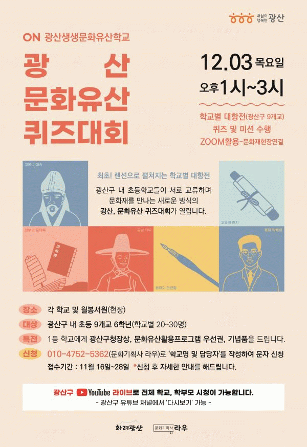 [¹Ìµð¾îÀü³² ±èÁ¤¿ì ±âÀÚ] ±¤»ê±¸°¡ ¡®±¤»ê, ¹®ÈÀ¯»ê ÄûÁî´ëȸ¡¯ Âü°¡ ÃʵîÇб³¸¦ 28ÀϱîÁö ¼±Âø¼ø ¸ðÁýÇÑ´Ù. ´ÙÀ½´Þ 3ÀÏ ÁøÇàµÇ´Â À̹ø ÄûÁî´ëȸ´Â, »õ·Î¿î ¹æ½ÄÀ¸·Î ½Ã¹ÎÀÌ Áö¿ª ¹®ÈÀ¯»ê°ú ¸¸³ª´Â ÀåÀÇ Çϳª·Î ÃʵîÇб³ 6ÇгâµéÀÌ ¡¦