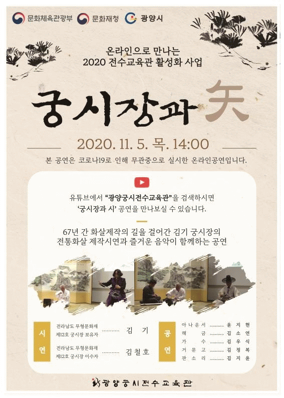[¹Ìµð¾îÀü³² ÀüÇü¼º ±âÀÚ] ±¤¾ç½Ã´Â Áö³ 5ÀÏ Àü¶ó³²µµ ¹«Çü¹®ÈÀç Á¦12È£ ±Ã½ÃÀå ±è±â ¼±»ýÀÇ ¡®±Ã½ÃÀå°ú ½Ã¡¯ °ø¿¬ÀÌ À¯Æ©ºê ä³Î ¡®±¤¾ç±Ã½ÃÀü¼ö±³À°°ü¡¯À» ÅëÇØ ¿¾ú´Ù°í ¹àÇû´Ù. À̹ø °ø¿¬Àº ¹®ÈÀçû °ø¸ð»ç¾÷ÀÎ ¡®2020 Àü¼ö±³À°°ü¡¦
