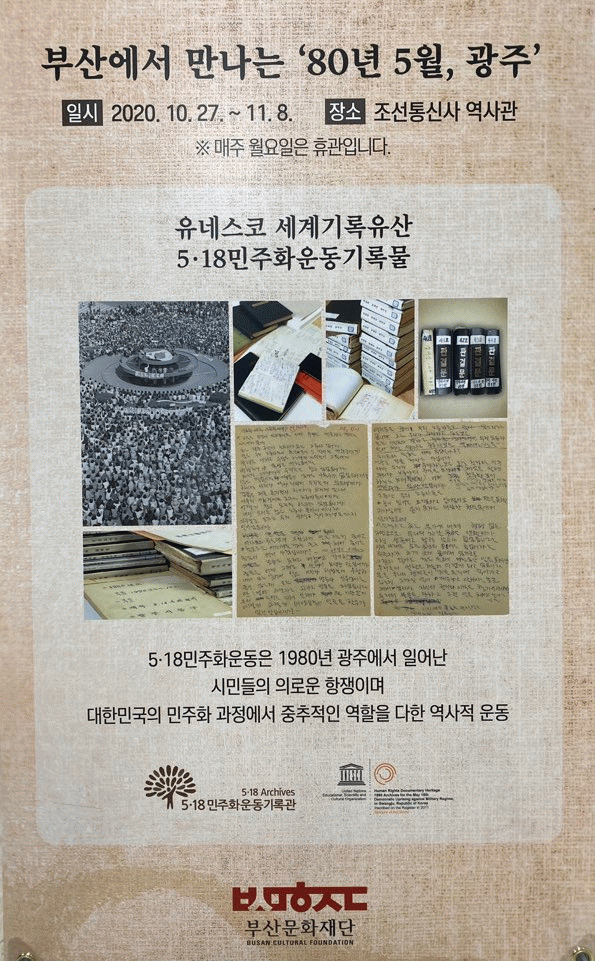 [¹Ìµð¾îÀü³² Á¦°¥´ëÁ¾ ±âÀÚ] ±¤ÁÖ±¤¿ª½Ã 5¡¤18¹ÎÁÖȿ±â·Ï°üÀº ºÎ»ê¹®ÈÀç´Ü°ú °øµ¿À¸·Î ¿À´Â 11¿ù8ÀϱîÁö ºÎ»ê½Ã Á¶¼±Åë½Å»ç ¿ª»ç°ü¿¡¼ À¯³×½ºÄÚ ¼¼°è±â·ÏÀ¯»ê ¼ÒÀå±â°ü ÃÊû Àü½Ã ¡®ºÎ»ê¿¡¼ ¸¸³ª´Â 80³â 5¿ù ±¤ÁÖ¡¯¸¦ °³ÃÖÇϰí ÀÖ¡¦