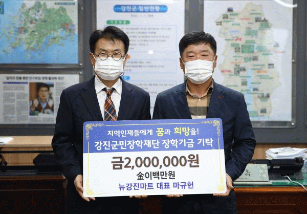 [¹Ìµð¾îÀü³² Á¦°¥´ëÁ¾ ±âÀÚ] Áö³ 21ÀÏ ´º°Áø¸¶Æ®¿¡¼ 200¸¸¿ø, °Áø µ¿¼º±³È¸¿¡¼ 100¸¸¿øÀÇ ÀåÇбÝÀ» °Áø±º¹ÎÀåÇÐÀç´Ü¿¡ ±âŹÇß´Ù. ´º°Áø¸¶Æ®´Â Àü³² °Áø±º °ÁøÀ¾ ¼¼º¸®¿¡ ¼ÒÀçÇϰí ÀÖÀ¸¸ç ¿ÃÇØ °³Á¡ 20ÁÖ³âÀ» ¸Â´Â À¯Åë, µµ¡¤¡¦