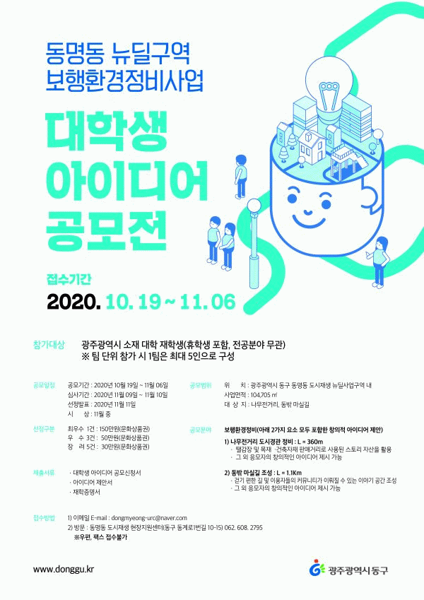 [¹Ìµð¾îÀü³² ±èÁ¤¿ì ±âÀÚ] ±¤ÁÖ µ¿±¸´Â ´ëÇлýµéÀÇ ´Ù¾çÇÑ »ó»ó·ÂÀ» µµ½ÃÀç»ý ÇöÀå¿¡ ´ã±â À§ÇÑ 'µµ½ÃÀç»ý´ºµô»ç¾÷ ´ëÇлý ¾ÆÀ̵ð¾î °ø¸ðÀü'À» °³ÃÖÇÑ´Ù°í ¹àÇû´Ù. À̹ø °ø¸ð´Â µ¿¸íµ¿ µµ½ÃÀç»ý´ºµô»ç¾÷±¸¿ª ³» ¡®º¸Çàȯ°æ Á¤ºñ¡¯¶ó´Â ÁÖ¡¦
