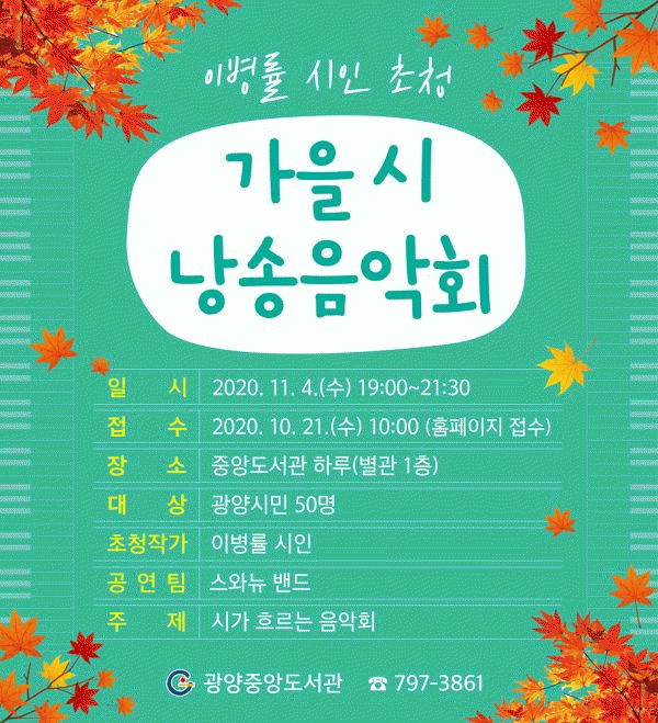 [¹Ìµð¾îÀü³² ÀüÇü¼º ±âÀÚ] ±¤¾ç½Ã´Â ¿À´Â 11¿ù 4ÀÏ Àú³á 7½Ã ±¤¾çÁß¾Óµµ¼°ü ÇÏ·ç¿¡¼ À̺´·ü ½ÃÀÎÀ» ÃÊÃ»ÇØ ¡®°¡À» ½Ã ³¶¼Û À½¾Çȸ¡¯¸¦ ¿¬´Ù°í ¹àÇû´Ù. ¡®½Ã°¡ È帣´Â À½¾Çȸ¡¯ ÁÖÁ¦ÀÎ À̹ø Çà»ç¿¡¼ À̺´·ü ½ÃÀÎÀº ¡®½Ã¸¦ ÅëÇÑ ¿©Ç࡯¡¦