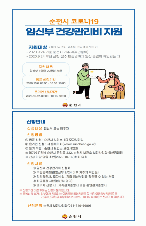 [¹Ìµð¾îÀü³² ÀüÇü¼º ±âÀÚ] ¼øÃµ½Ã´Â Äڷγª19 °¨¿° Ãë¾à°èÃþÀÎ ÀӽźÎÀÇ °Ç°ÇÑ Ãâ»êÀ» À§ÇØ Äڷγª19 ÀӽźΠ°Ç°°ü¸®ºñ·Î Àδç 20¸¸¿øÀ» Áö¿øÇÑ´Ù. Áö¿ø´ë»óÀº 9¿ù 24ÀϺÎÅÍ 10¿ù 16ÀϱîÁö ÀӽŠÁßÀÓÀÌ È®ÀεǴ ¼øÃµ½Ã °ÅÁÖÀÚ·Î Àӽš¦