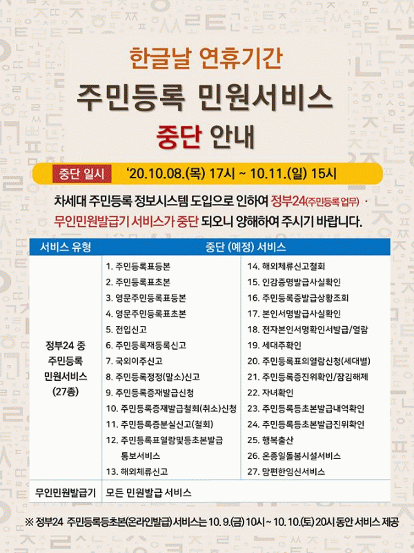 [¹Ìµð¾îÀü³² Á¦°¥´ëÁ¾ ±âÀÚ] Àü¶ó³²µµ´Â Çѱ۳¯ ¿¬ÈޱⰣ Àü¡¤ÈÄÀÎ 8ÀÏ ¿ÀÈÄ 5½ÃºÎÅÍ 11ÀÏ ¿ÀÈÄ 3½Ã±îÁö ¡®Á¤ºÎ24¡¯ÀÇ Áֹεî·Ï °ü·Ã ¾÷¹«¿Í ¹«Àιοø¹ß±Þ±â ¼ºñ½º°¡ Áß´ÜµÈ´Ù°í ¹àÇû´Ù. ´çÃÊ 5ÀÏ Â÷¼¼´ë Áֹεî·Ï½Ã½ºÅÛ Ãâ¹üÀ» À§ÇØ ¡¦
