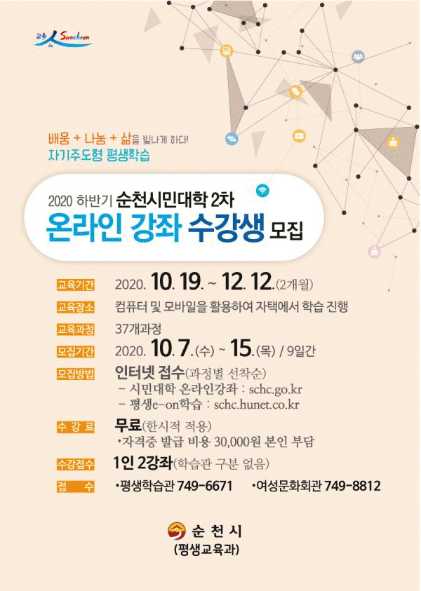 [¹Ìµð¾îÀü³² ÀüÇü¼º ±âÀÚ] ¼øÃµ½Ã´Â 2020³â ÇϹݱ⠼øÃµ½Ã¹Î´ëÇÐ ¿Â¶óÀÎ ÇÁ·Î±×·¥¿¡ Âü¿©ÇÒ ¼ö°»ýÀ» ¿À´Â 10¿ù 7ÀϺÎÅÍ 15ÀϱîÁö 9Àϰ£ ¸ðÁýÇÑ´Ù. ¼øÃµ½Ã¹Î´ëÇÐ ¿Â¶óÀÎ °Á´ Áܰú À¯Æ©ºê¸¦ ÅëÇØ ¼ÒÅëÇÏ´Â ¹æ½ÄÀ¸·Î Áý¿¡¼ Áö¼ÓÀûÀÎ ¡¦
