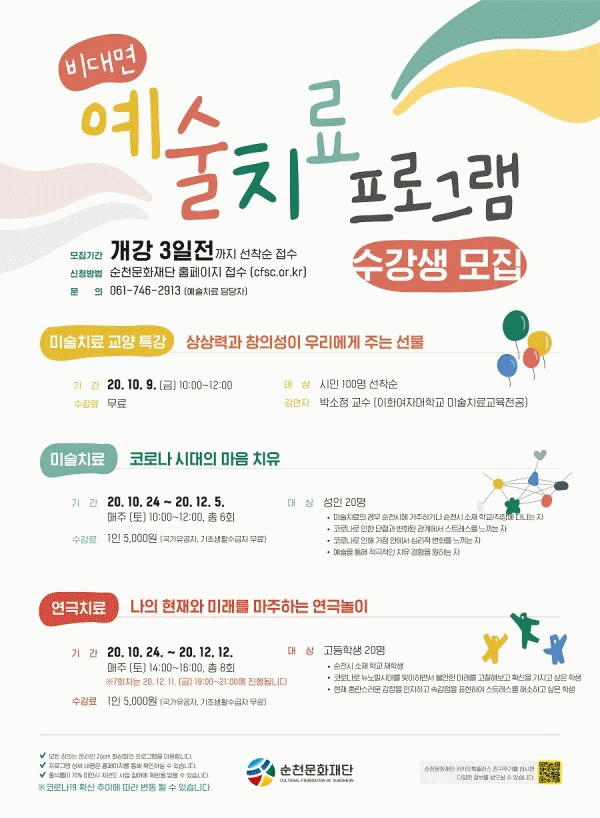 [¹Ìµð¾îÀü³² ÀüÇü¼º ±âÀÚ] ¼øÃµ¹®ÈÀç´ÜÀº ¿À´Â 10¿ù 24ÀϺÎÅÍ 12¿ù±îÁö ÁøÇàÇÒ ºñ´ë¸é ¿¹¼úÄ¡·á ±³À° ¼ö°»ýÀ» ¼±Âø¼ø ¸ðÁý ÁßÀÌ´Ù. ºñ´ë¸é ¿¹¼úÄ¡·á ÇÁ·Î±×·¥Àº Äڷγª19 Àå±âÈ¿¡ µû¶ó ½Ã¹ÎµéÀÇ °©ÀÛ½º·¯¿î ÀÏ»óÀÇ Á¤¼Àû º¯È¸¦ ¿¹¼ú¡¦