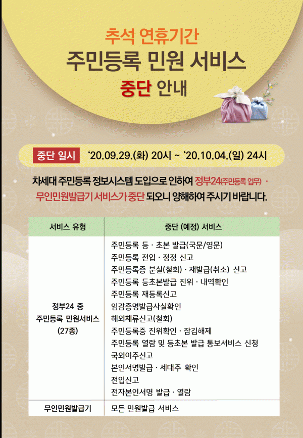 [¹Ìµð¾îÀü³² Á¦°¥´ëÁ¾ ±âÀÚ] ¿µ±¤±ºÀº ¿À´Â 9¿ù 29ÀÏ 20½ÃºÎÅÍ 10¿ù 4ÀÏ 24½Ã±îÁö Á¤ºÎ24 Áß Áֹεî·Ï ¹Î¿ø¼ºñ½º¿Í °ü³» ¼³Ä¡µÅ ÀÖ´Â ¹«Àιοø¹ß±Þ±âÀÇ ¸ðµç ¼ºñ½º°¡ ÀϽà Áß´ÜµÈ´Ù°í ¹àÇû´Ù. ÀÌ´Â ÇàÁ¤¾ÈÀüºÎ ÁÖ°ü Â÷¼¼´ë Áֹεî·ÏÁ¤¡¦