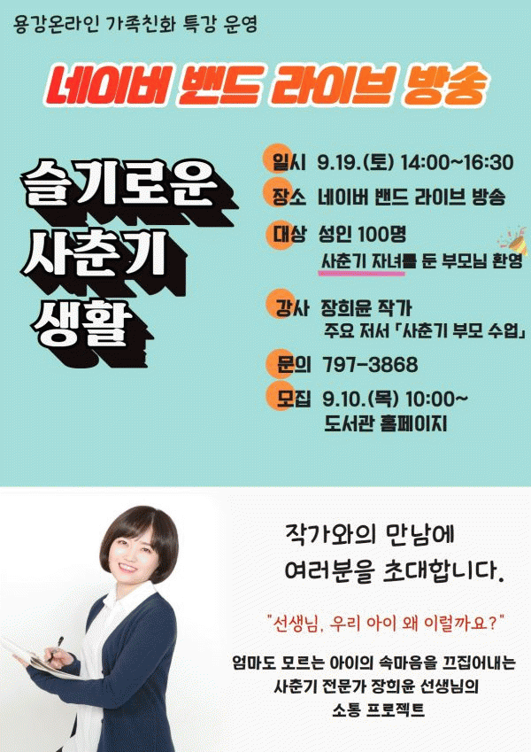 [¹Ìµð¾îÀü³² ÀüÇü¼º ±âÀÚ] ±¤¾ç¿ë°µµ¼°üÀº ¿À´Â 19ÀÏ »çÃá±â Àڳ౳À° Àü¹®°¡ ÀåÈñÀ± ÀÛ°¡¸¦ ÃÊÃ»ÇØ ºñ´ë¸é ¿Â¶óÀÎ °¡Á· Ä£È Æ¯° ¡®½½±â·Î¿î »çÃá±â »ýȰ¡¯À» °³ÃÖÇÑ´Ù°í ¹àÇû´Ù. À̹ø °¿¬Àº °¡Á· Ä£È ÇÁ·Î±×·¥ ¸¸Á·µµ ¼³¹®Á¶»ç¿¡¡¦