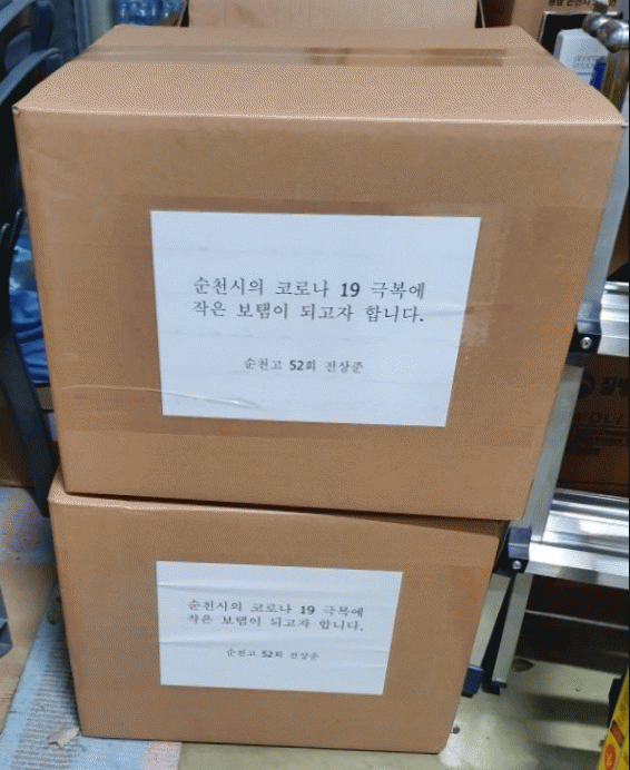 [¹Ìµð¾îÀü³² ÀüÇü¼º ±âÀÚ] ¼øÃµ½Ã¿¡ Äڷγª19 ±Øº¹À» À§ÇÑ °³ÀÎ, ±â¾÷ü µî¿¡¼ ¹æ¿ª¹°Ç° Àü´ÞÀÌ ¿¬ÀÏ °è¼ÓµÇ°í ÀÖ´Ù. Áö³ 2ÀÏ ¼øÃµ°í 52ȸ Á¹¾÷»ýÀÎ Àü»óÁØ´ÔÀÌ KF94 ¸¶½ºÅ© 1,000¸Å¸¦, ½ÅÁøÅ×Å©´Â 3ÀÏ ½ºÇÁ·¹ÀÌÇü ¼Õ¼Òµ¶Á¦ 500°³¸¦ °ü¡¦