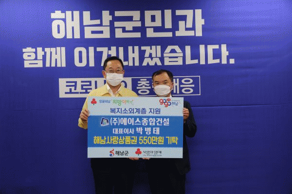 [¹Ìµð¾îÀü³² À±º¸Çö ±âÀÚ] ¢ß ¿¡À̽ºÁ¾ÇհǼ³ ¹Úº´Å ´ëÇ¥ÀÌ»ç´Â Áö³ 1ÀÏ ÇØ³²±ºÃ»À» ã¾Æ ¿Áõ¸é ¼ÒÀç ³ë¼÷ÀÎ °ÅÁֽü³ ¸®¸ðµ¨¸µ »ç¾÷ºñ¿¡ ½á ´Þ¶ó¸ç ÇØ³²»ç¶û»óǰ±Ç 550¸¸¿øÀ» Àü´ÞÇß´Ù. ¹Ú ´ëÇ¥ÀÌ»ç´Â Áö¿ª»çȸ °øÇåÀ» À§ÇØ Áö³ÇØ¡¦