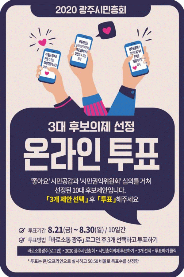 [¹Ìµð¾îÀü³² Á¦°¥´ëÁ¾ ±âÀÚ] ±¤ÁÖ±¤¿ª½Ã´Â ¡®2020 ±¤ÁֽùÎÃÑȸ¡¯¿¡ »óÁ¤ÇÒ 3´ë Èĺ¸ÀÇÁ¦¸¦ Á¤ÇÏ´Â ½Ã¹ÎÅõÇ¥¸¦ ¿Â¡¤¿ÀÇÁ¶óÀÎÀ¸·Î ½Ç½ÃÇÑ´Ù. ±¤Áֽô Áö³ 14ÀϱîÁö ¿Â¶óÀÎ ¹ÎÁÖÁÖÀÇ Ç÷§Æû ¡®¹Ù·Î¼ÒÅ뱤ÁÖ¡¯¸¦ ÅëÇØ ½Ã¹Îµé·ÎºÎÅÍ ±¤ÁÖ¡¦